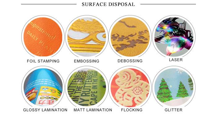 表面処理 | エンボス加工、ホットスタンピング、バニシング、UVコーティング、スポットUV、光沢ラミネーション、マットラミネーション、フィルムラミネーションなど |
